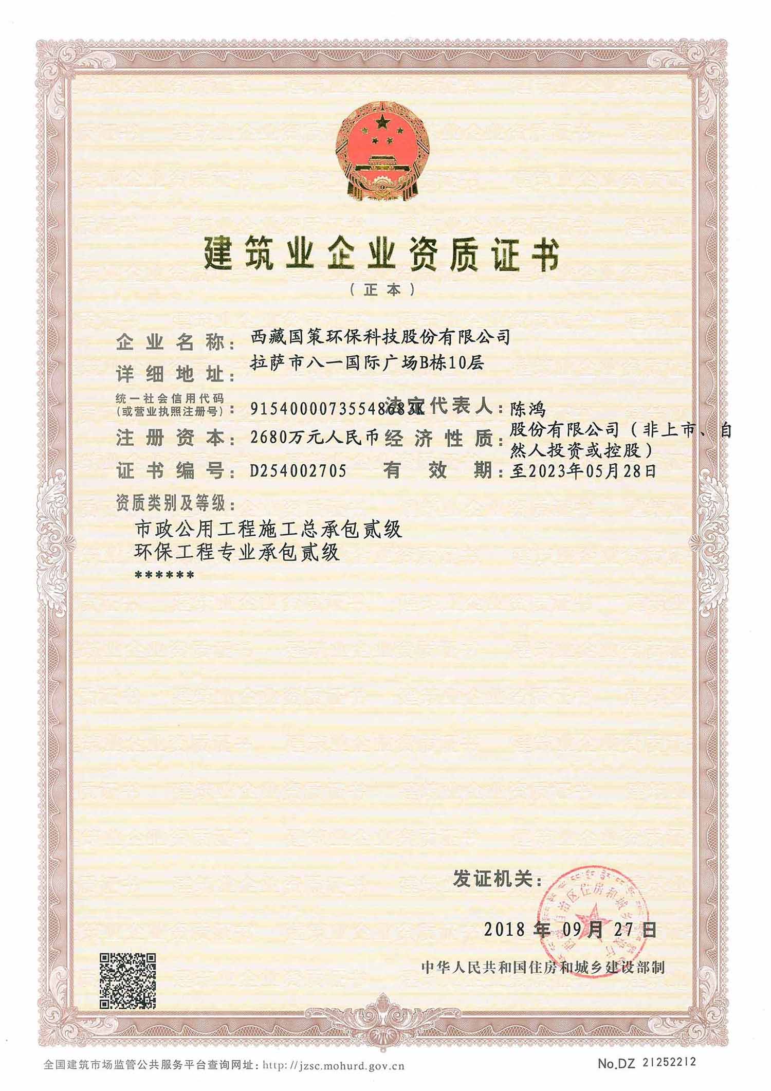 國策環(huán)保擁有住房和城鄉(xiāng)建設(shè)部頒發(fā)的建筑業(yè)企業(yè)市政公用工程施工總承包貳級資質(zhì)、環(huán)保工程專業(yè)承包貳級資質(zhì),同時(shí)擁有環(huán)保、市政、機(jī)電等各類專業(yè)工程技術(shù)人員共計(jì)40余人,并先后承擔(dān)了眾多污水廠、垃圾填埋場、自來水廠、醫(yī)療廢物處置中心等項(xiàng)目的施工任務(wù)。