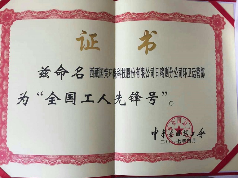 日前,全國(guó)總工會(huì)召開“五一”新聞發(fā)布會(huì), 通報(bào)了一批“2017年全國(guó)工人先鋒號(hào)”。西藏國(guó)策環(huán)保科技股份有限公司日喀則分公司運(yùn)營(yíng)部全體成員在日常工作中勞心勞力、風(fēng)雨無阻、踐行無私奉獻(xiàn)的城市“美容師”精神,被授予“2017年全國(guó)工人先鋒號(hào)”,是我司首獲此殊榮。